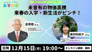 12月15日(月)19時から、第1回あすのばオンライン・フォーラム「未曾有の物価高騰 来春の入学・新生活がピンチ!」を開催します。ゲストに泉房穂・参議院議員をお招きします。