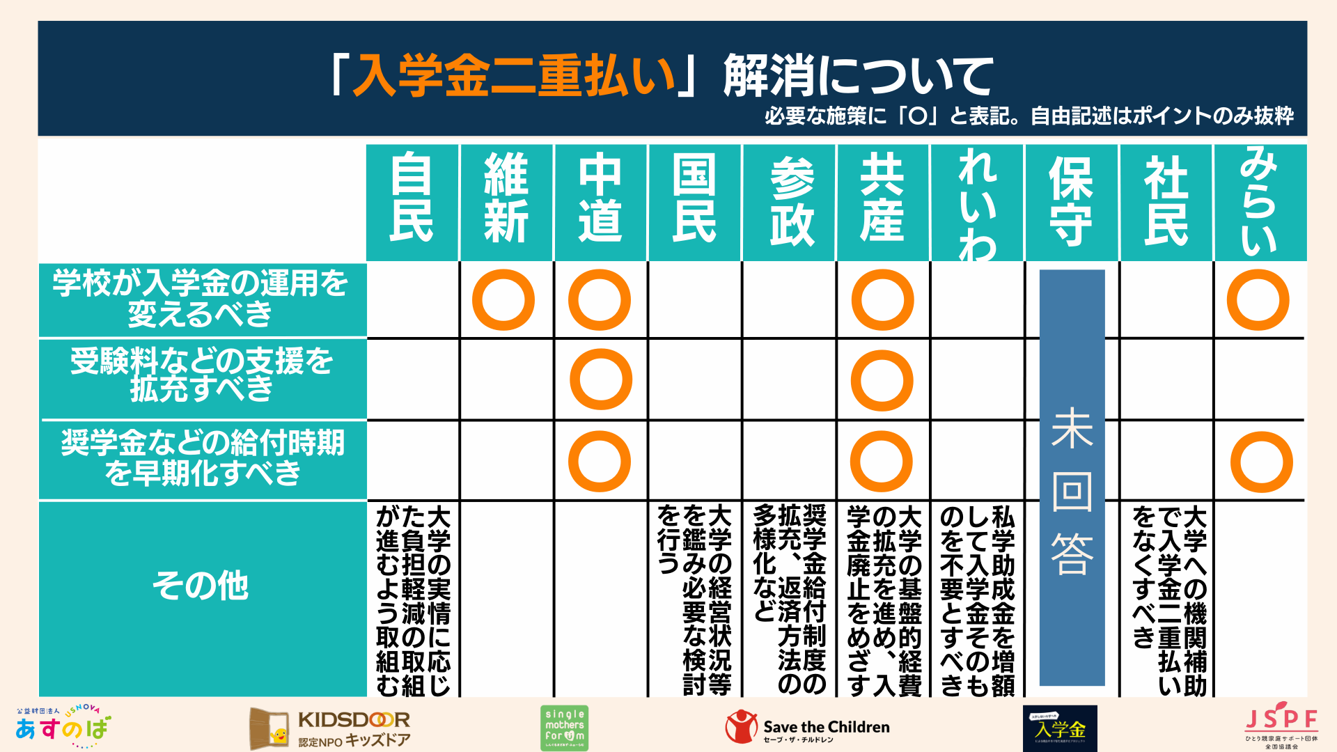 ●実施団体:公益財団法人あすのば、認定特定非営利活動法人キッズドア、特定非営利活動法人しんぐるまざあず・ふぉーらむ、公益社団法人セーブ・ザ・チルドレン・ジャパン、入学金調査プロジェクト、特定非営利活動法人ひとり親家庭サポート団体全国協議会(50音順)