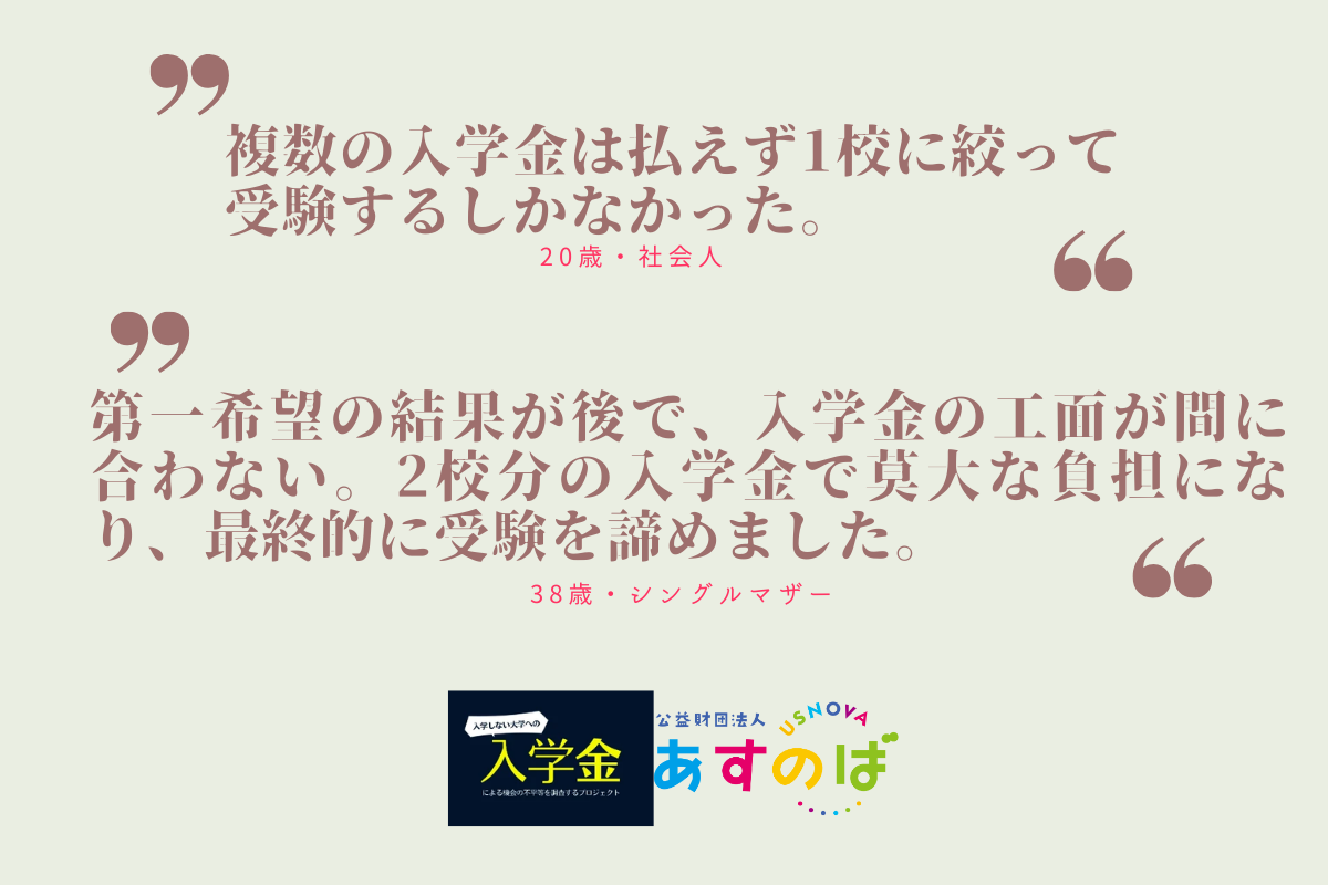 この度、公益財団法人『あすのば』(代表:小河光治)は、大学の「入学金二重払い」の問題に取り組んでいる『入学金調査プロジェクト』(発起人:五十嵐悠真、糸井明日香)のアンケートに調査協力を行いました。
